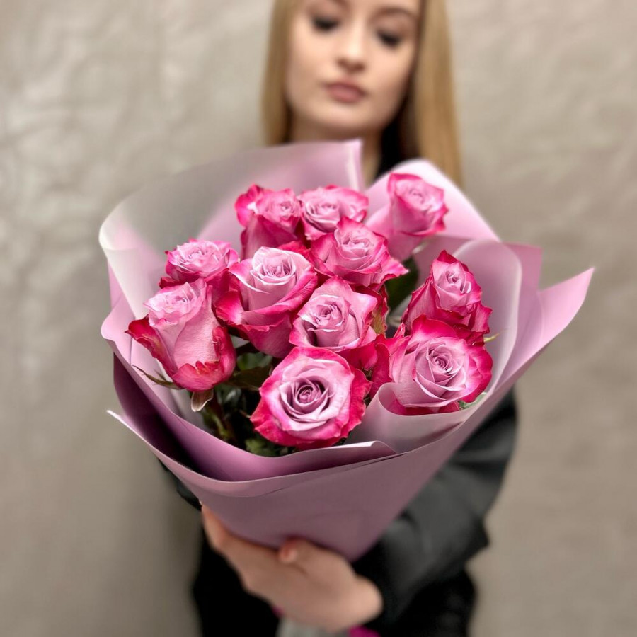 На фото букет из 11 фиолетовых роз. В составе: роза 11 шт, дизайнерская упаковка 1 шт, атласная лента 1 шт, . Все цветы свежие и ароматные, букет красиво оформлен и отлично подходит для подарка. Доступна доставка цветов или самовывоз.