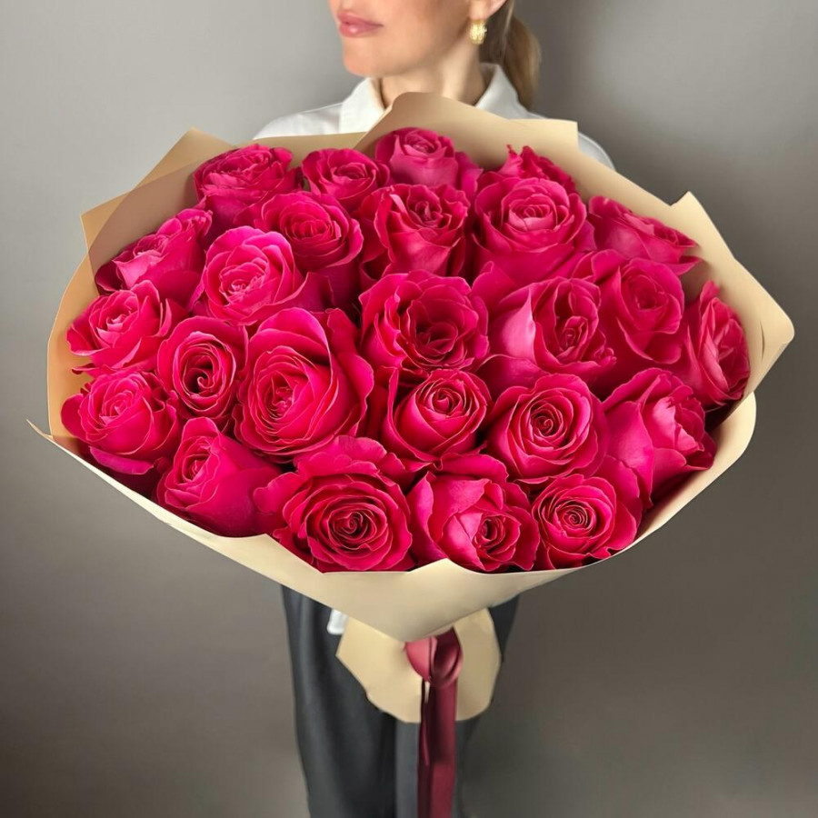 На фото букет из 25 малиновых роз. В составе: роза 25 шт, крафт-бумага 1 шт, атласная лента 1 шт, . Все цветы свежие и ароматные, букет красиво оформлен и отлично подходит для подарка. Доступна доставка цветов или самовывоз.